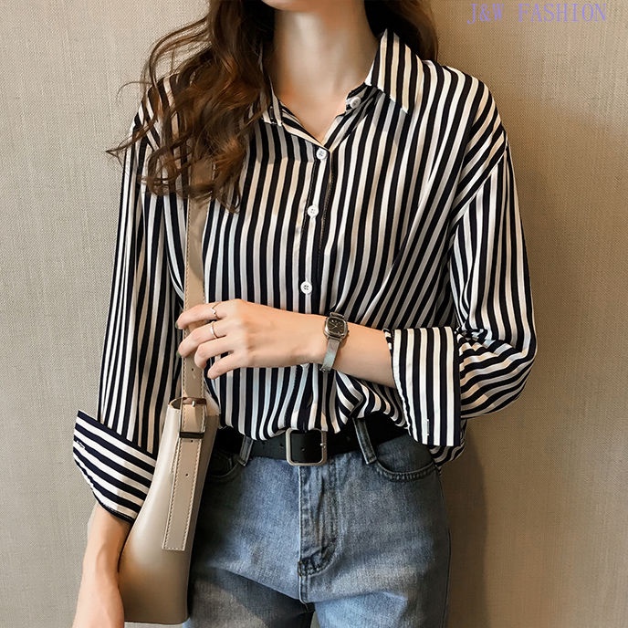 Tops For Women Striped Polo Shirt Women S Korean Style Long Sleeved Blouse Tops Shopee Philippines